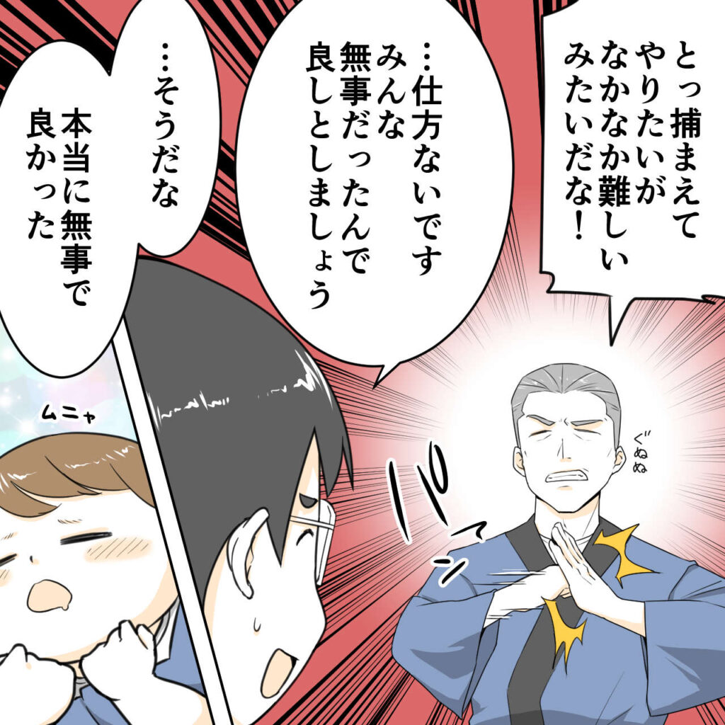 その後、「とっ捕まえてやりたいが、なかなか難しいみたいだな!」と怒りをあらわにする父に、「・・仕方ないです。みんな無事だったんで良しとしましょう」夫がなだめると、「・・そうだな。本当に無事でよかった」とすやすやと眠るソウスケを見て父も納得しました。
