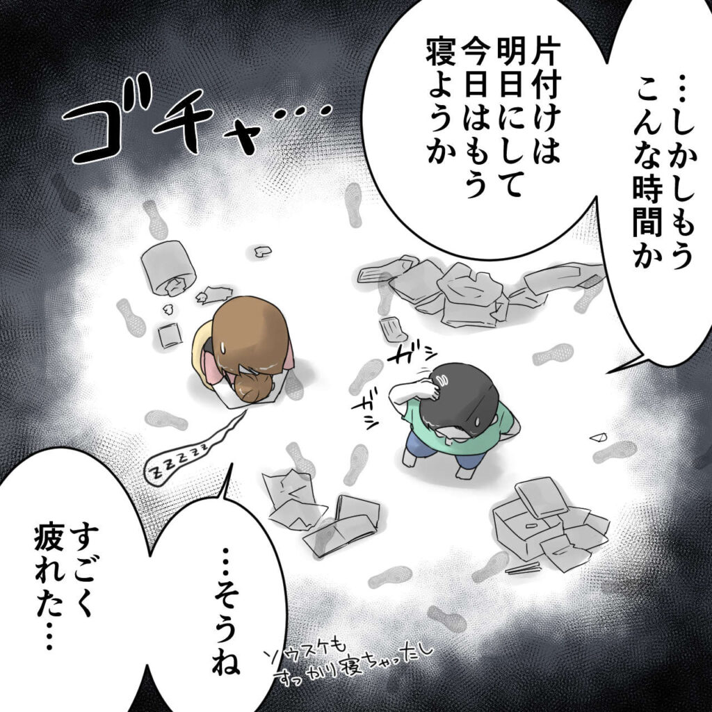 その後、「・・しかしもうこんな時間か。片付けは明日にして、今日はもう寝ようか」夫にそう言われ、「・・そうね。すごく疲れた・・」と答え、寝ることにしました。