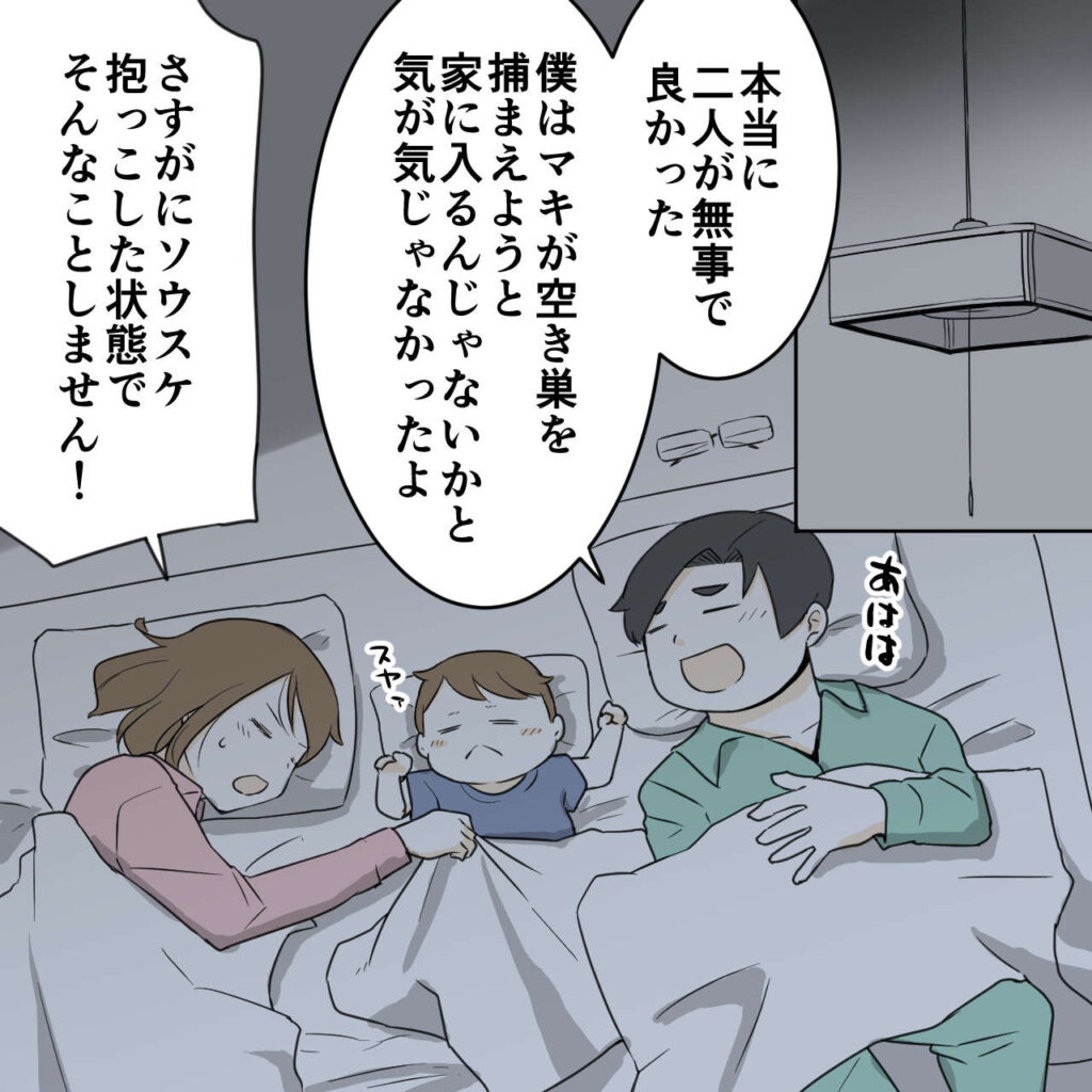 布団に入ると、「本当に二人が無事で良かった。僕はマキが空き巣を捕まえようと家に入るんじゃないかと気が気じゃなかったよ」そう言って笑う夫に、「さすがにソウスケ抱っこした状態でそんなことしません!」と反論した後、