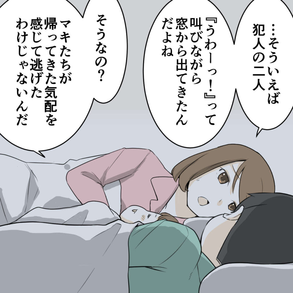 「・・そういえば犯人の二人、『うわーーっ!』って叫びながら窓から出てきたんだよね」そう言うと、「そうなの?マキたちが帰ってきた気配を感じて逃げたわけじゃないんだ」と夫に言われ、