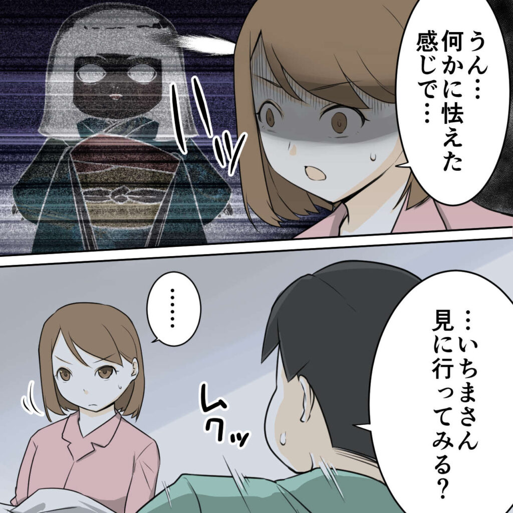 「うん・・何かに怯えた感じで・・」と言いながら、「ハッ」と思い浮かんだのはいちまさんのこと。すると、それに気づいたように、「・・いちまさん見に行ってみる?」起き上がりながら夫にそう言われ、考え込んでしまいました。