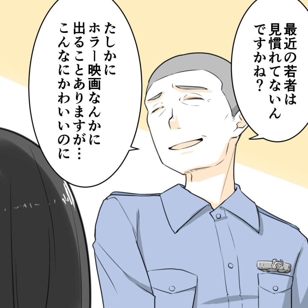 するとおまわりさんが、「最近の若者は見慣れてないんですかね?たしかにホラー映画なんかに出ることありますが・・こんなにかわいいのに」と市間さんを見ながら言った後、