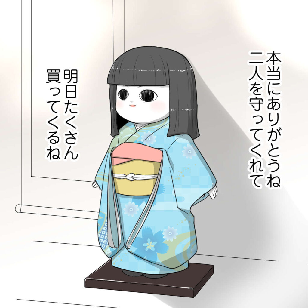 何かに怯えていたような犯人たちの様子から、いちまさんのことを思い出し、床の間に駆け付けると、倒れたいちまさんの姿が!きっと助けてくれたに違いないと、大泣きしながら夫がお礼を言ってから数日後のこと、あの時一緒に来てくれたおまわりさんがやって来て犯人が自首したと言い、「なんか先が読める気がする」と思っていると、案の定、「客間で市松人形を見て逃げ出した」と聞いて「やっぱり」と納得しました。