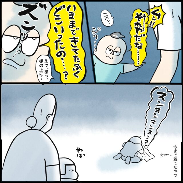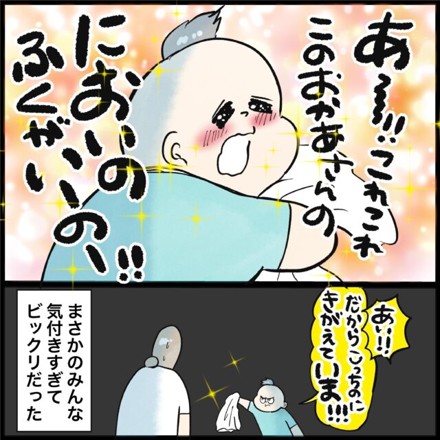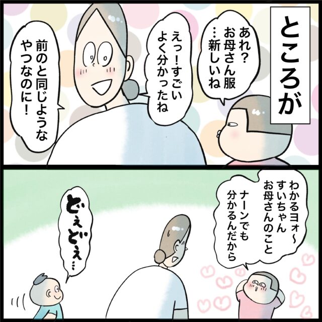 お母さんの匂いで癒されるヨウちゃん、とっても可愛いですね!でも、新しい服が着られないのは困ります~!早く新しい服に匂いが定着しますように。