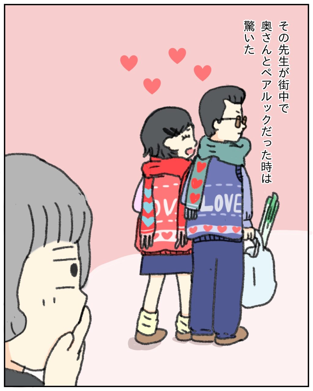 学校ではすごく怖い先生でしたが、奥さんとお買い物に行く先生の姿は大きな買い物袋を持ってあげて、なんとかわいいペアルック!見てはいけないものを見た気がして、私は誰にも言わず、そっと心にしまっていました。
