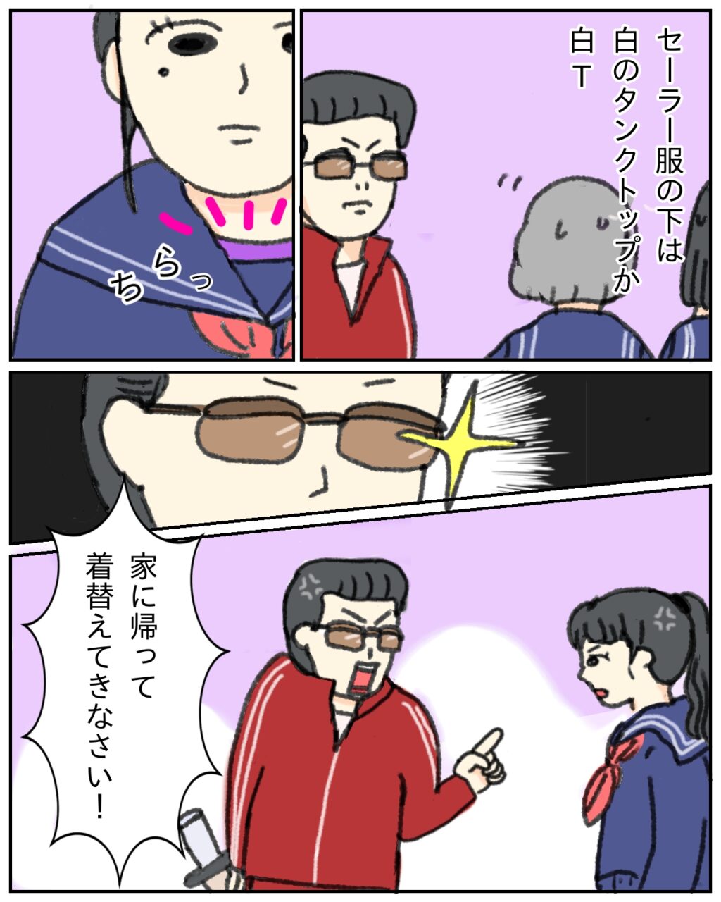 私が通っていた学校の制服はセーラー服でした。セーラー服の下に着るのは白のタンクトップか白いTシャツという校則がありましたが、どうせ見えないからといって紫のタンクトップを着ていると強面先生の目がキラリ!チラリと見えてしまった紫色を絶対に見逃さないんですよね。家に帰って着替えてまた登校する羽目になるのでした。怖いよ先生。