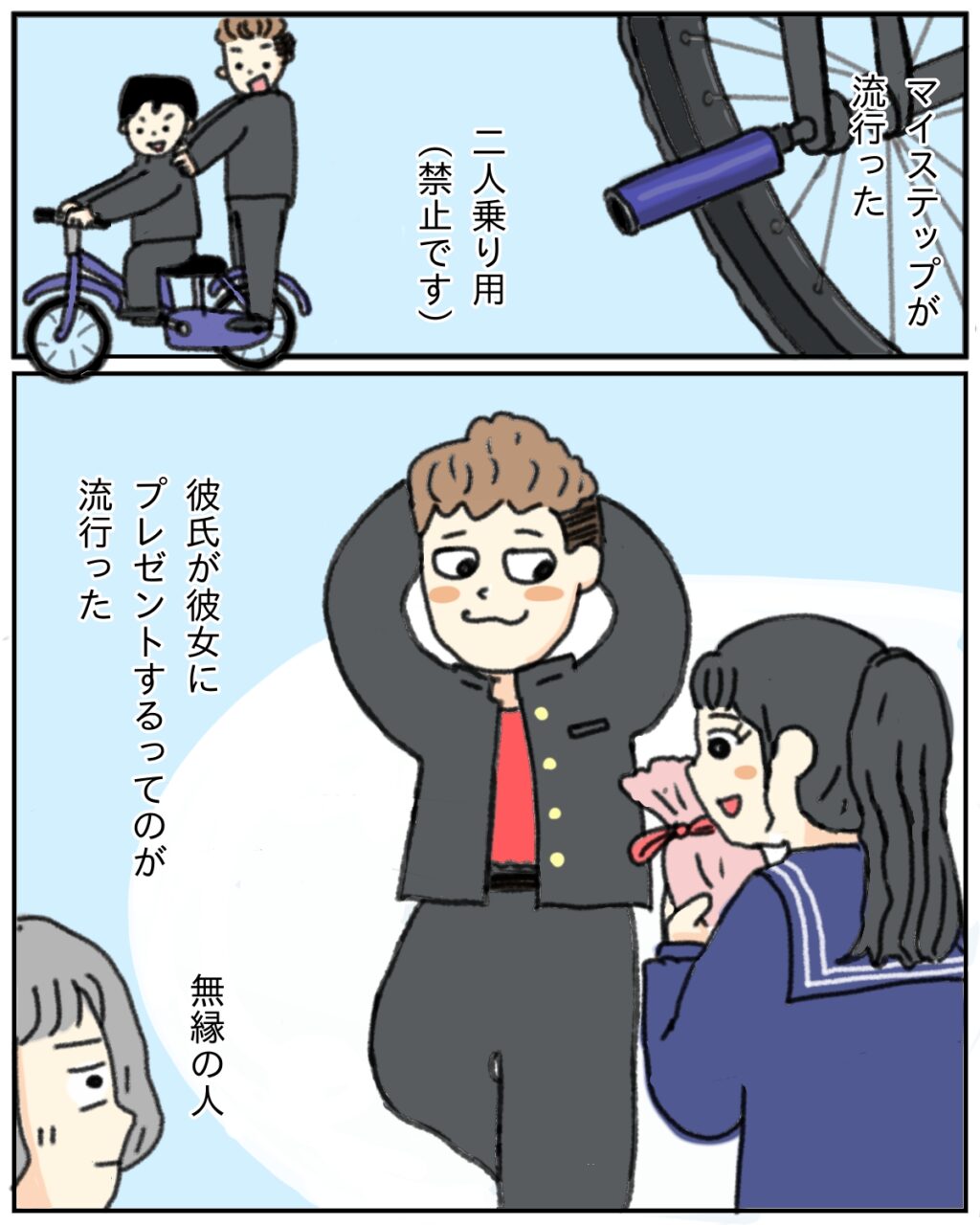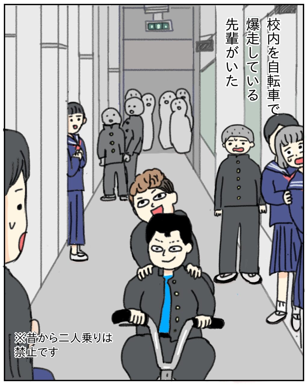 学校にはやんちゃな先輩たちがチラホラ。校内を自転車で爆走するとんでも先輩もいましたよ。今も昔も2人乗りは禁止ですからね!先輩たちが自転車で廊下を疾走するのをよけるの大変だったけど、意外に慣れてくるものです。先輩たちは先生に追いかけられるのも楽しそうだったな。