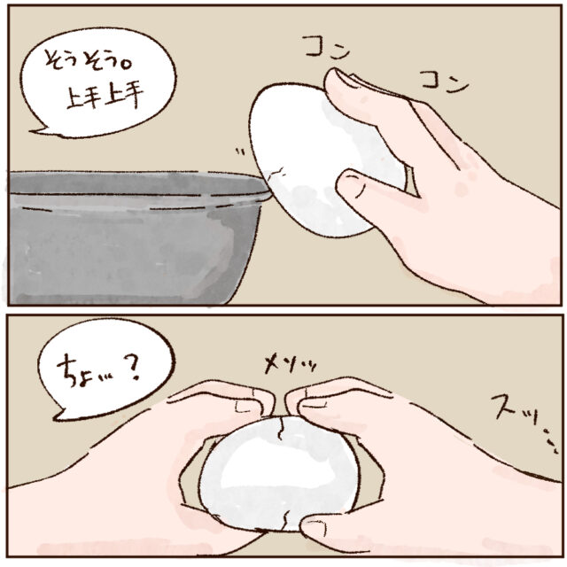 ゆで卵を殻の状態から真っ二つに割った人初めて見ました。