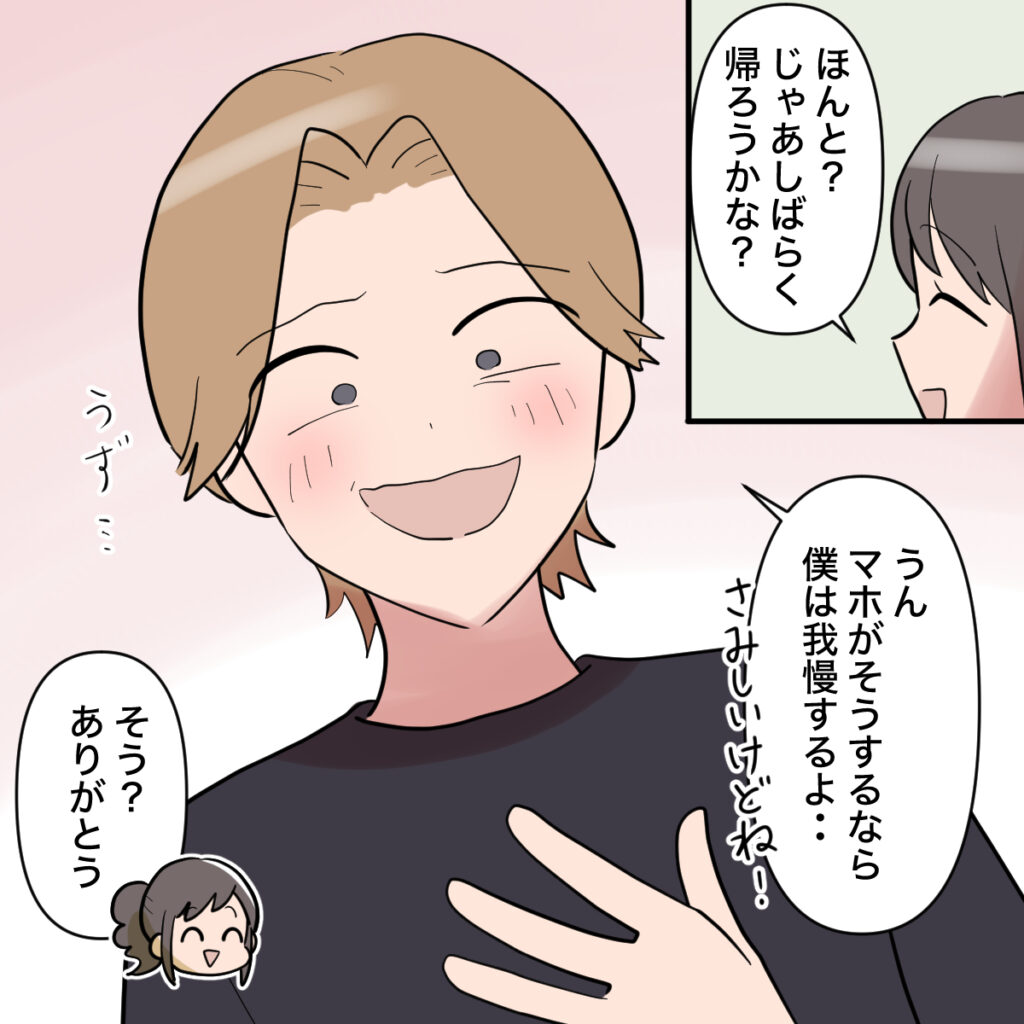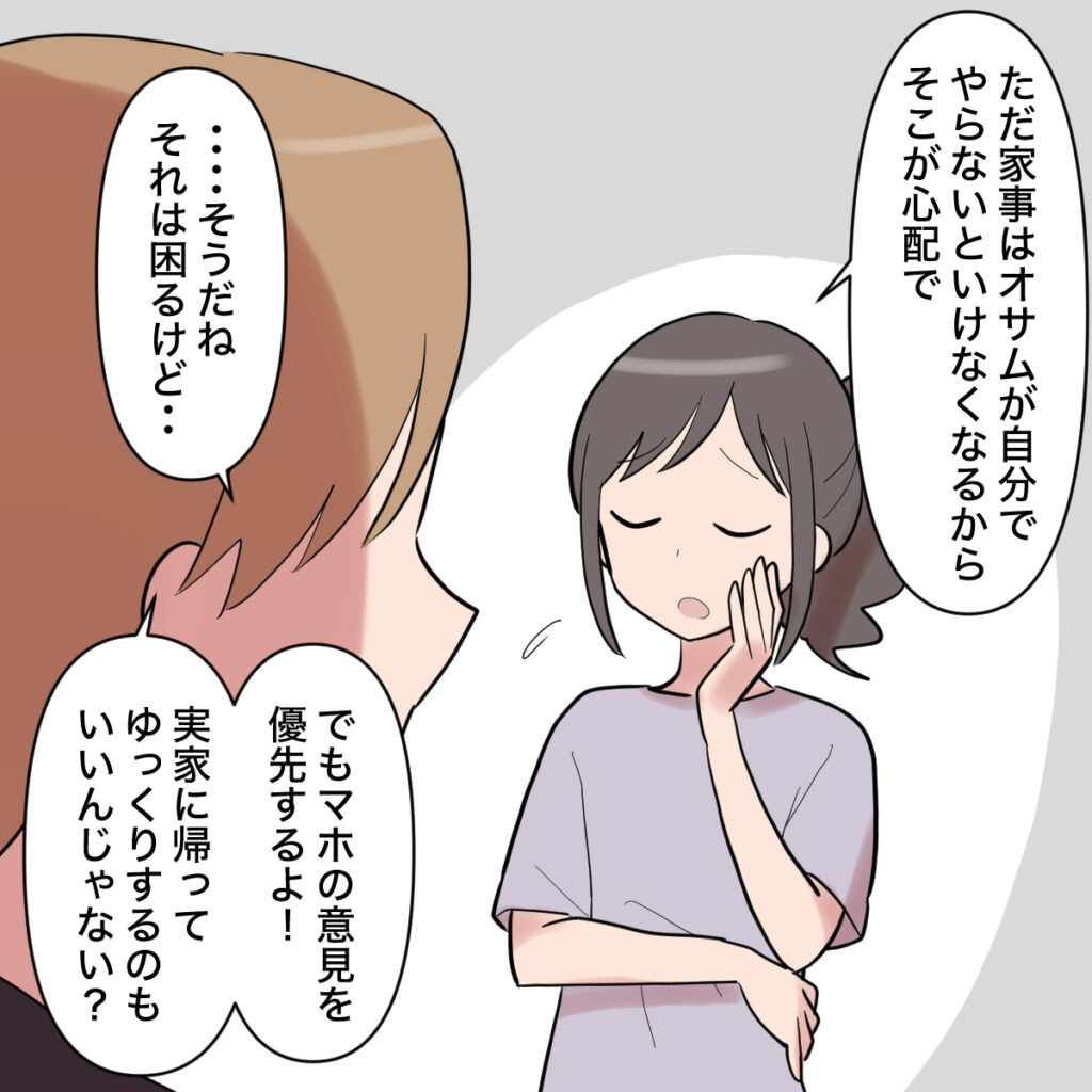 「ただ家事はオサムが自分でやらないといけなくなるから、そこが心配で・・」私がそう言うと、「・・そうだね。それは困るけど・・でもマホの意見を優先するよ!実家に帰ってゆっくりするのもいいんじゃない?」と乗り気なオサム。