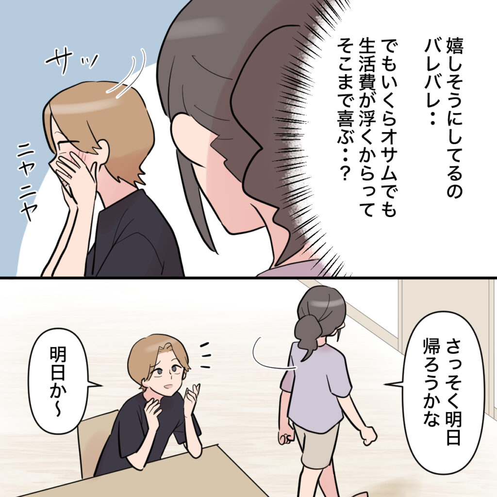 「嬉しそうにしてるのバレバレ・・でも、いくらオサムでも、生活費が浮くからってそこまで喜ぶ・・?」そう頭の中で考えていた私から顔が見えないようにするオサム。でもニヤニヤしているのははっきりわかりました。