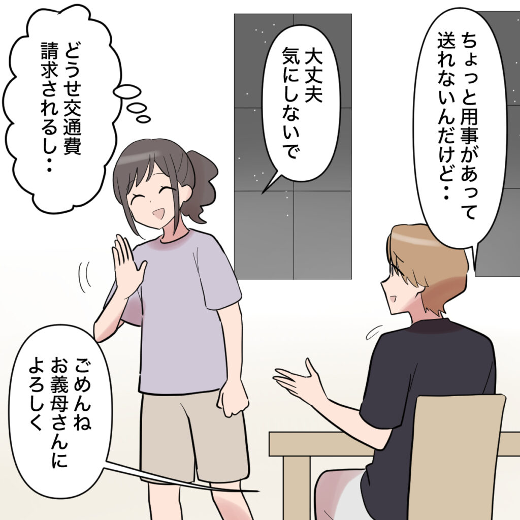 「ちょっと用事があって送れないんだけど・・」と言い出して、「大丈夫気にしないで」と答えた私が「どうせ交通費請求されるし・・」と思っていると、「ごめんね。お義母さんによろしく」とオサムが言いました。
