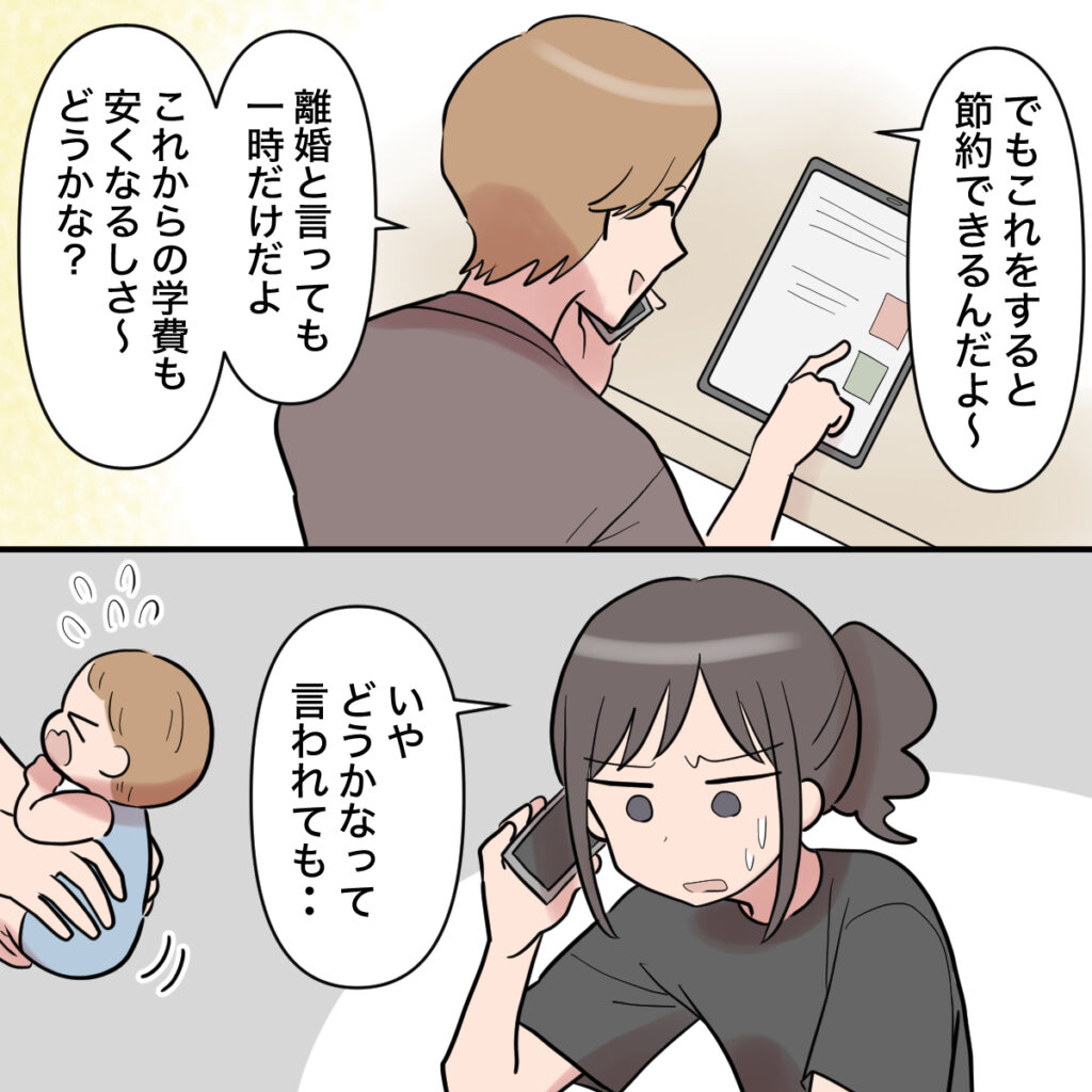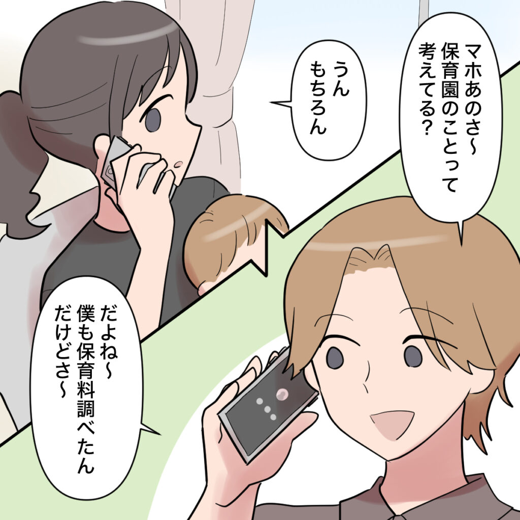 久しぶりにオサムさんから電話がかかって来ました。話の内容は保育園のこと。「またお金のこと・・」とドン引きするマホさんに、「安くなる方法を考えた」と話すオサムさんは、「僕たち離婚しない?」と離婚を提案。「これが一番いい方法なんだ」と話しながら、嬉々として迫るオサムさんの話を、素直に聞ける気がしませんよね。