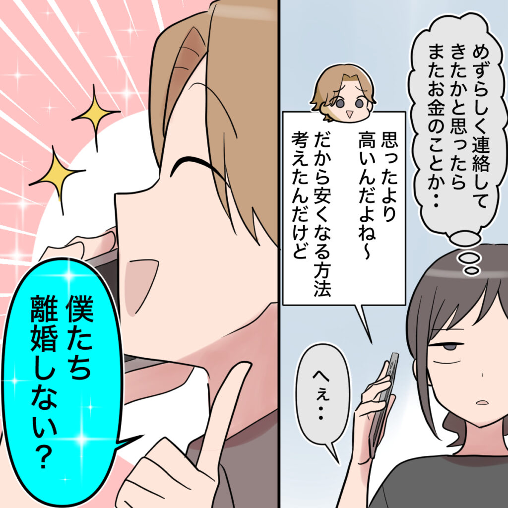 「めずらしく連絡してきたかと思ったらまたお金のことか・・」と心の中で呟くと、「思ったより高いんだよね~。だから安くなる方法考えたんだけど」とオサムが言い、「へぇ・・」と関心なさそうに返事しました。すると、「僕たち離婚しない?」と笑顔で言うオサム。
