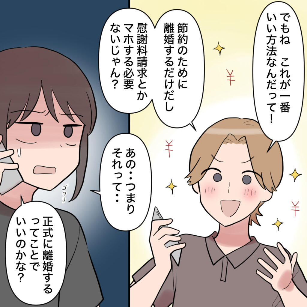 「でもね、これが一番いい方法なんだって!節約の為に離婚するだけだし、慰謝料請求とか、マホする必要ないじゃん?」嬉々として話すオサムに、「あの・・つまりそれって・・正式に離婚するってことでいいのかな?」と念の為確認することにしました。