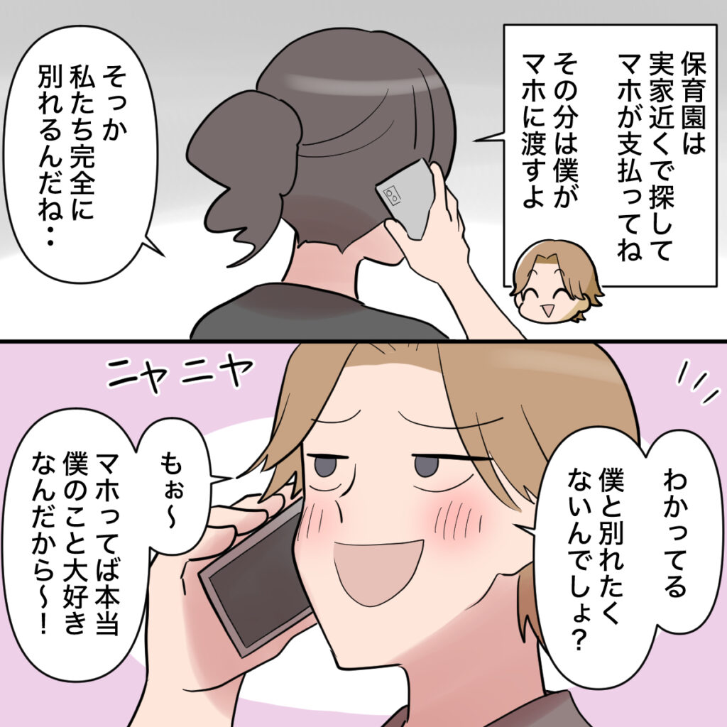 さらに、「保育園は実家近くで探してマホが支払ってね。その分は僕がマホに渡すよ」オサムの言葉に、「そっか。私たち完全に別れるんだね・・」私がそう言うと、「わかってる。僕と別れたくないんでしょ?もぉ~、マホってば本当僕のこと大好きなんだから~!」とニヤニヤしながらオサムが答えて、