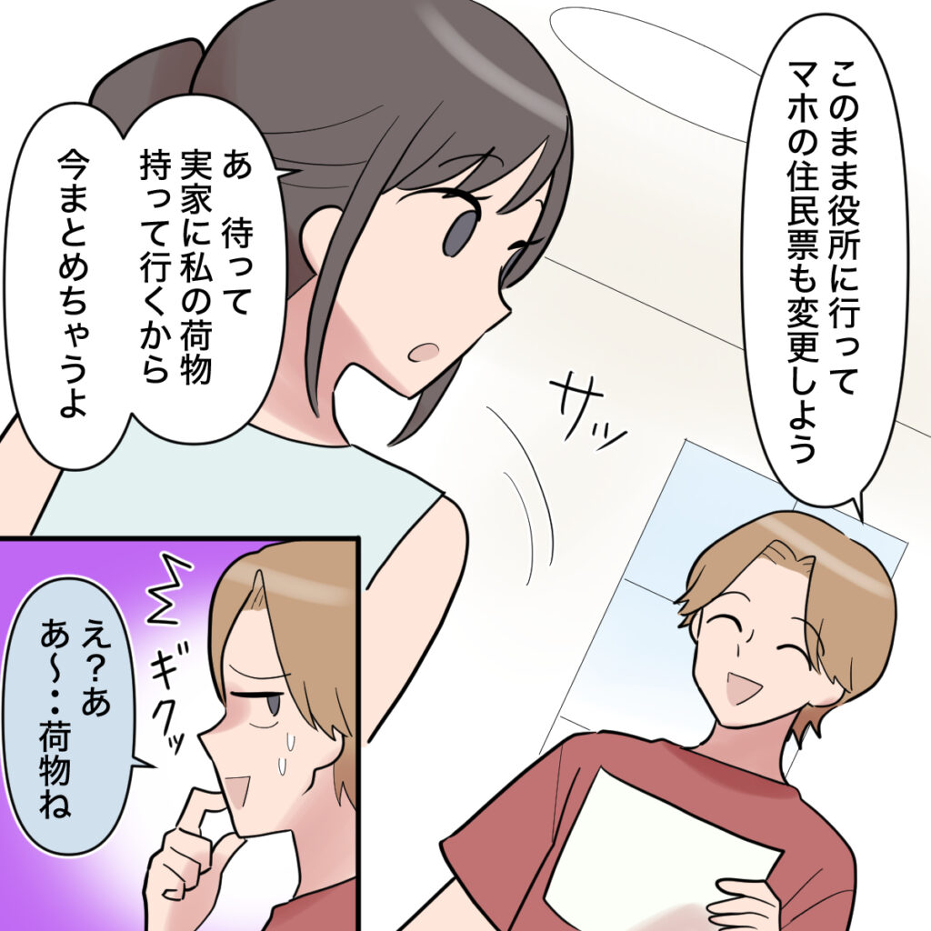 「このまま役所に行って、マホの住民票も変更しよう」と言うオサムに、「あ、待って。実家に私の荷物持って行くから。今まとめちゃうよ」と言うと、オサムがギクリとして、「え?あ、あ~・・荷物ね」と決まりが悪そうな様子。