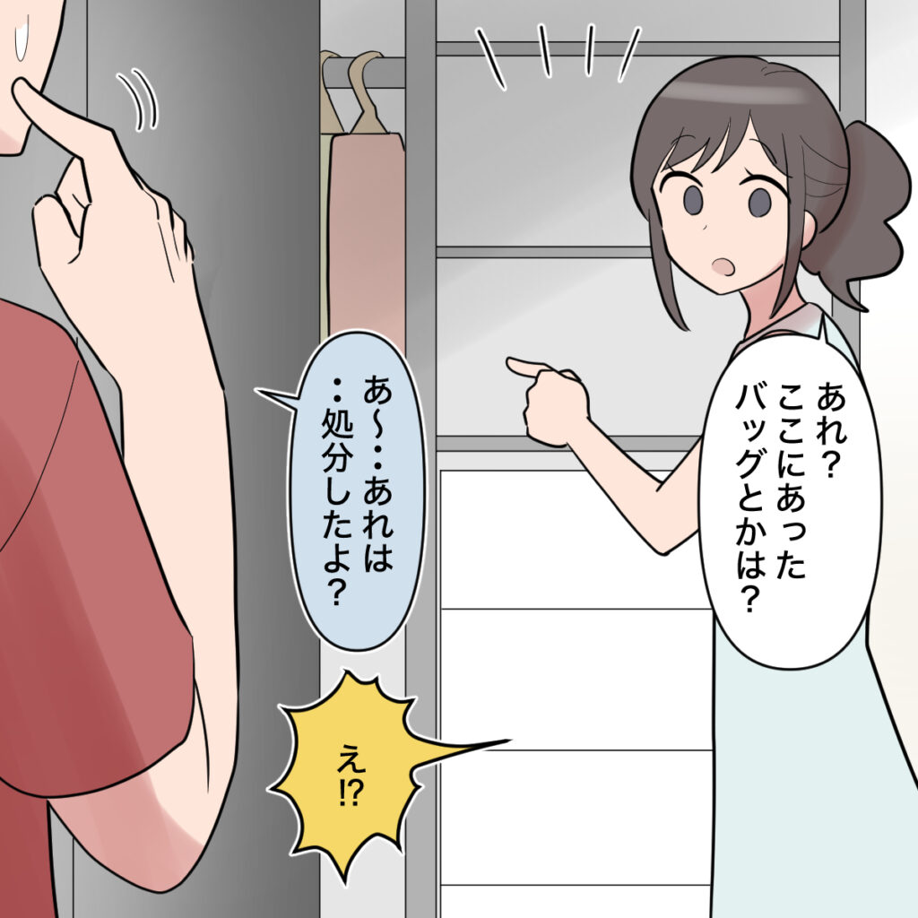 クローゼットを開けると明らかに物がない!そう思って「あれ?ここにあったバッグとかは?」と聞くと、「あ~・・あれは・・処分したよ?」オサムにそう言われて「え!?」とビックリ!