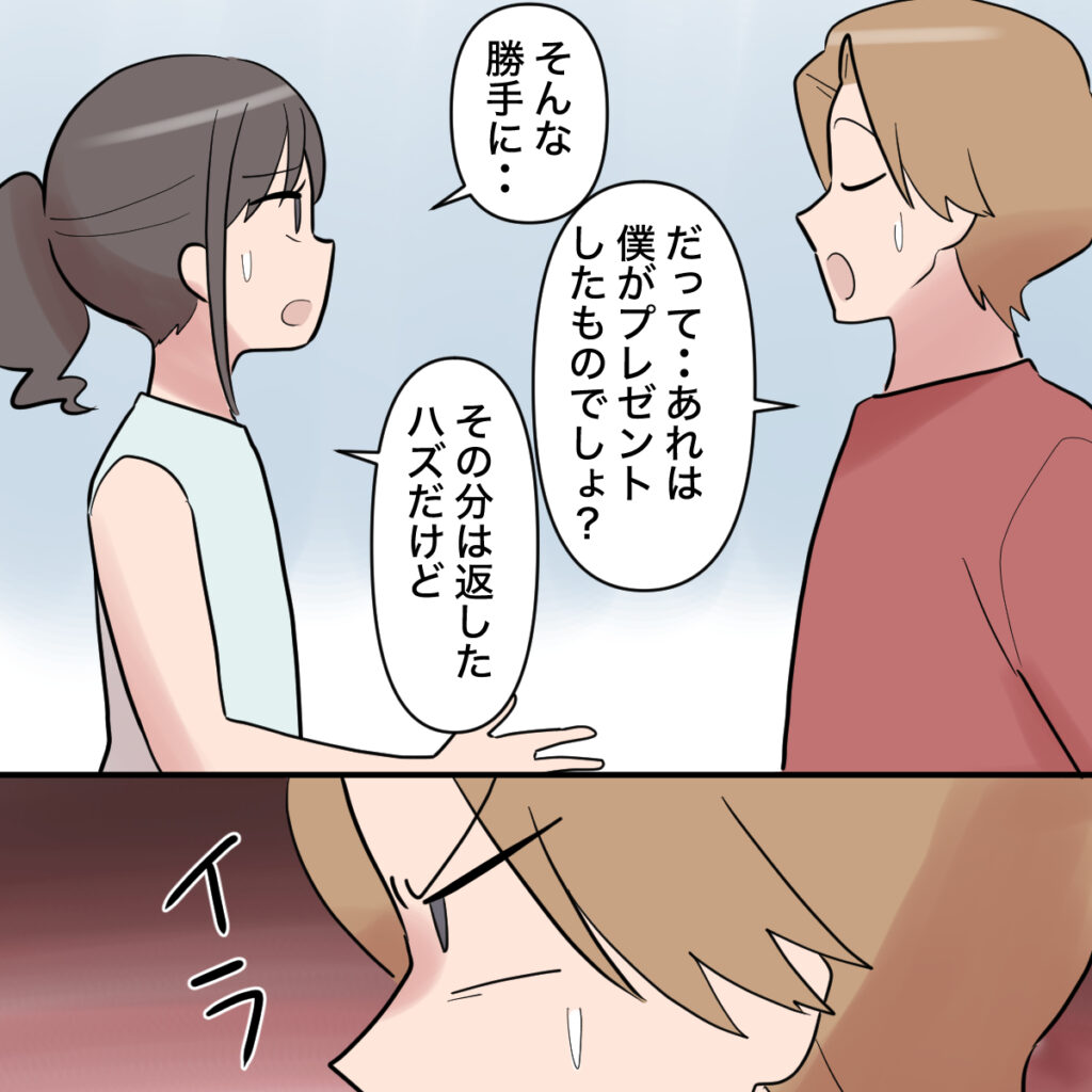 私が「そんな勝手に・・」と言うと、「だって・・あれは僕がプレゼントしたものでしょ?」と言い出すオサムに、「その分は返したハズだけど」と正論を言うと、なぜかオサムがイライラして、