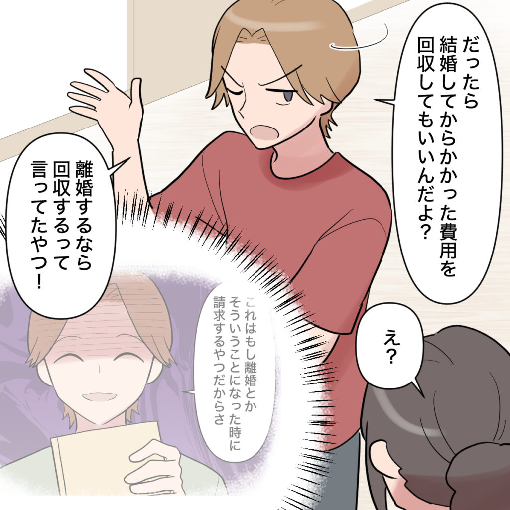 「だったら、結婚してからかかった費用を回収してもいいんだよ?離婚するなら回収するって言ってたやつ!」と怒りながら言い、「え?」と私はまた訳が分からなくなったのでした。
