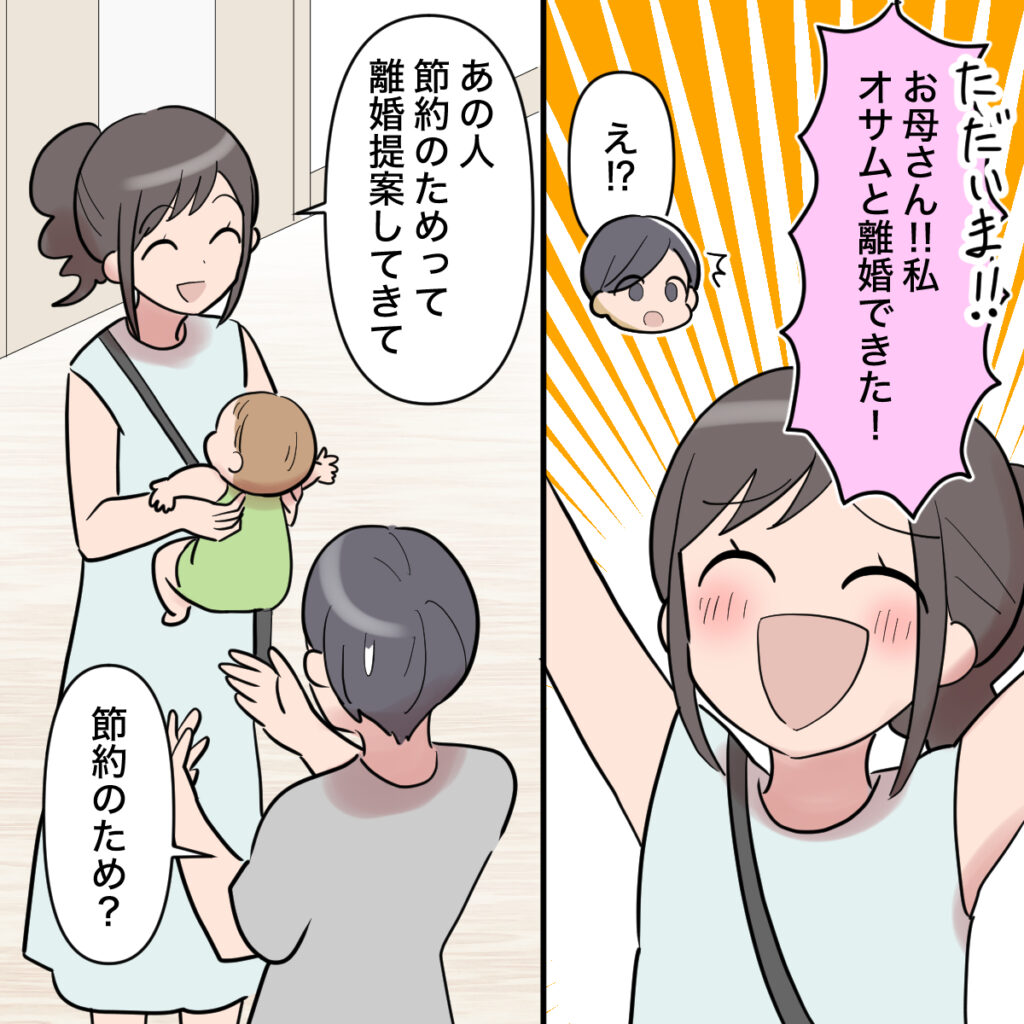 そして実家に帰り、「ただいま!!お母さん!!私オサムと離婚できた!」と大喜びして伝えると、「え!?」と驚くお母さんに、「あの人、節約のためって離婚提案してきて」と説明すると、「節約のため?」と不思議そうにたずねるお母さんに、