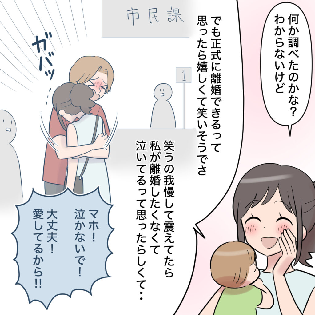 「何か調べたのかな?わからないけど。でも正式に離婚できるって思ったら、嬉しくて笑いそうでさ、笑うの我慢して震えてたら、私が離婚したくなくて泣いてるって思ったらしくて・・」と思い出して笑ってしまう私。
