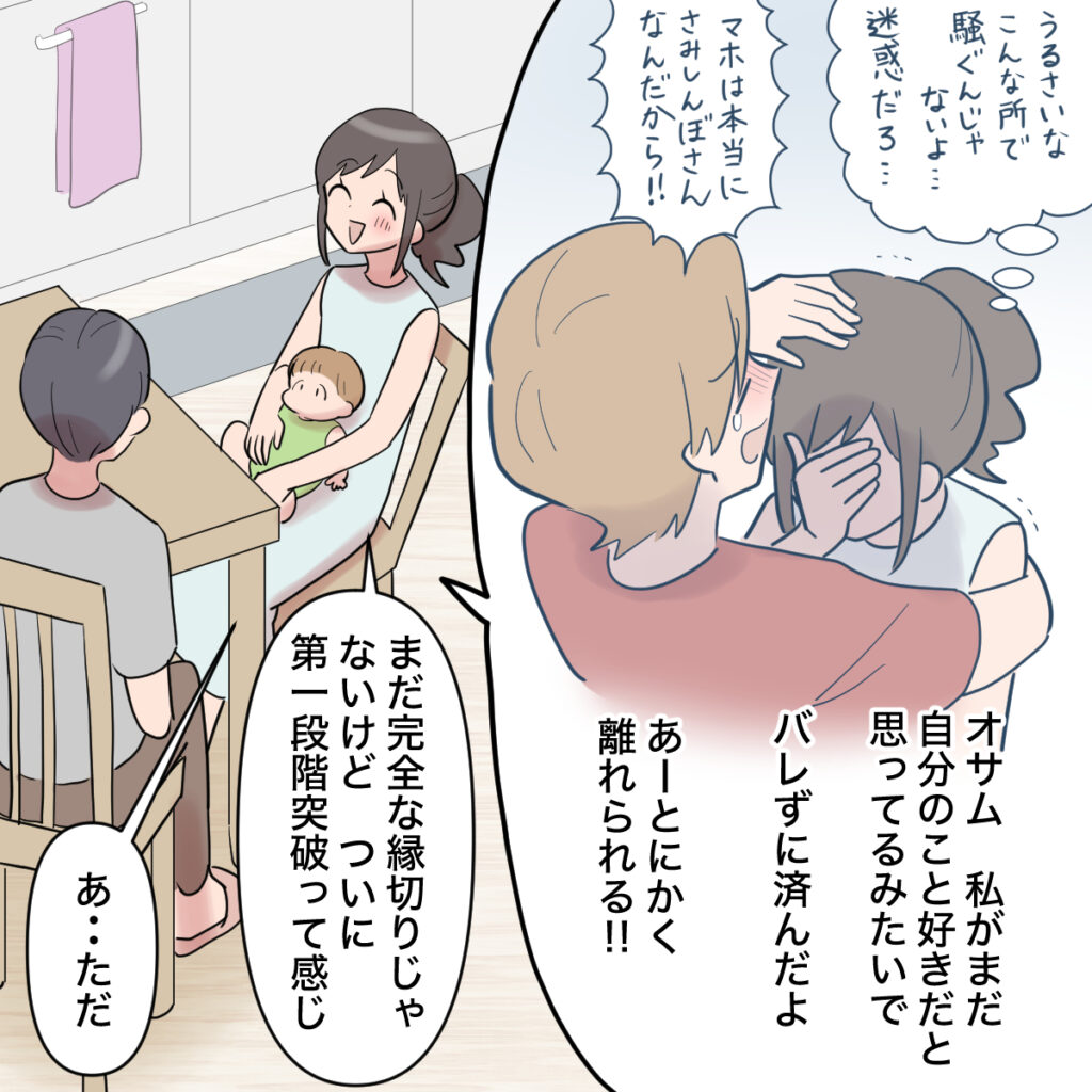 「『マホ泣かないで!大丈夫!愛してるから!!』と言われ、オサム、私がまだ自分のこと好きだと思ってるみたいで、バレずに済んだよ。あーとにかく離れられる!!」と大喜びの私は、「まだ完全な縁切りじゃないけど、ついに第一段階突破って感じ」そう言った後で、「あ・・ただ」、