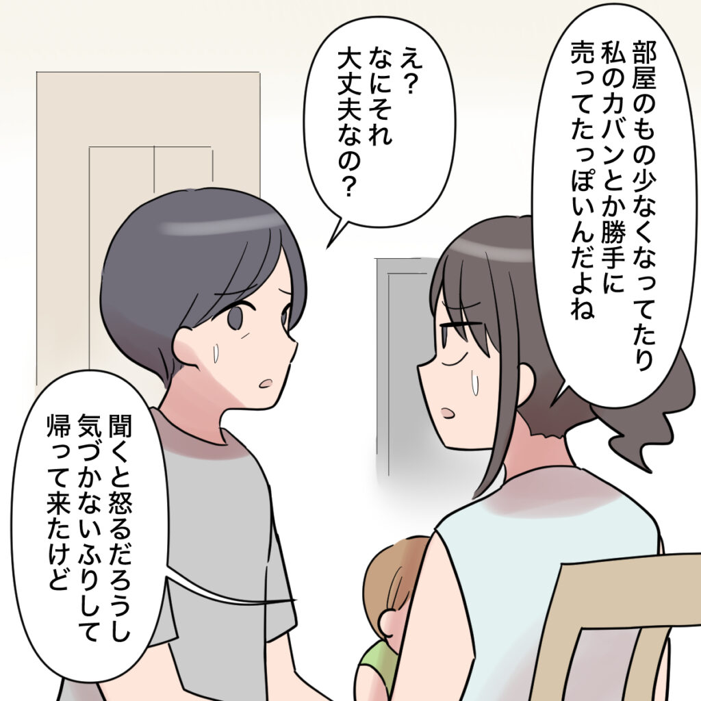 「部屋のものが少なくなってたり、私のカバンとか勝手に売ってたっぽいんだよね」と言うと、「え?なにそれ大丈夫なの?」と心配そうなお母さん。「聞くと怒るだろうし、気づかないふりして帰って来たけど」、