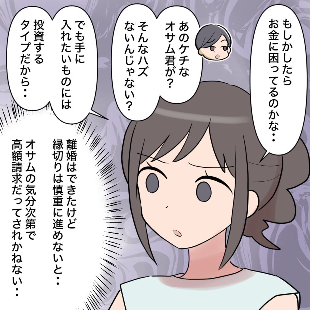 「もしかしたらお金に困ってるのかな・・」と言うと、「あのケチなオサムくんが?そんなハズないんじゃない?」とお母さん。「でも、手に入れたいものには投資するタイプだから・・」と言いながら、「離婚はできたけど、縁切りは慎重に進めないと・・オサムの気分次第で高額請求だってされかねない・・」と真剣に考えていました。