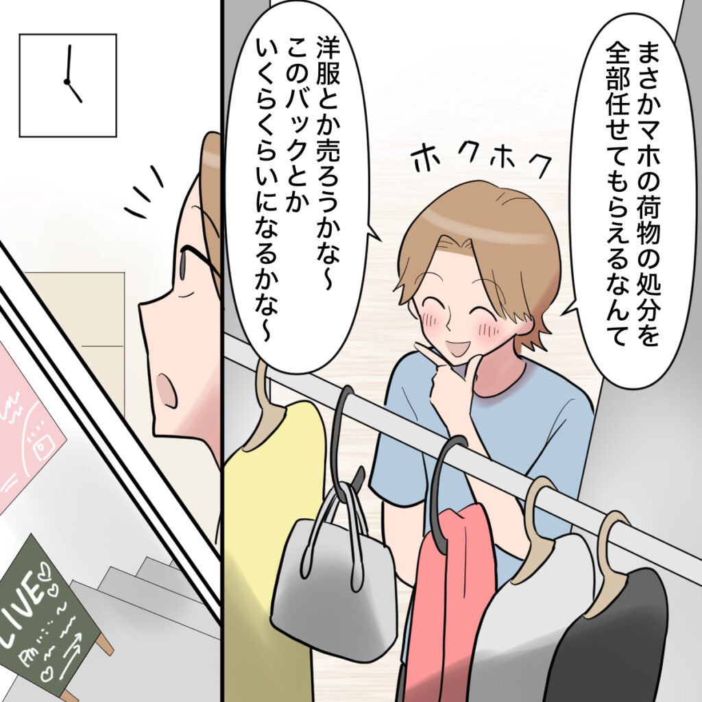 その頃家では、「まさかマホの荷物の処分を全部任せてもらえるなんて、洋服とか売ろうかな~。このバッグとかいくらくらいになるかな~」とホクホク顔のオサムは、時計を見ると、慌ててライブ会場に出かけて行きました。
