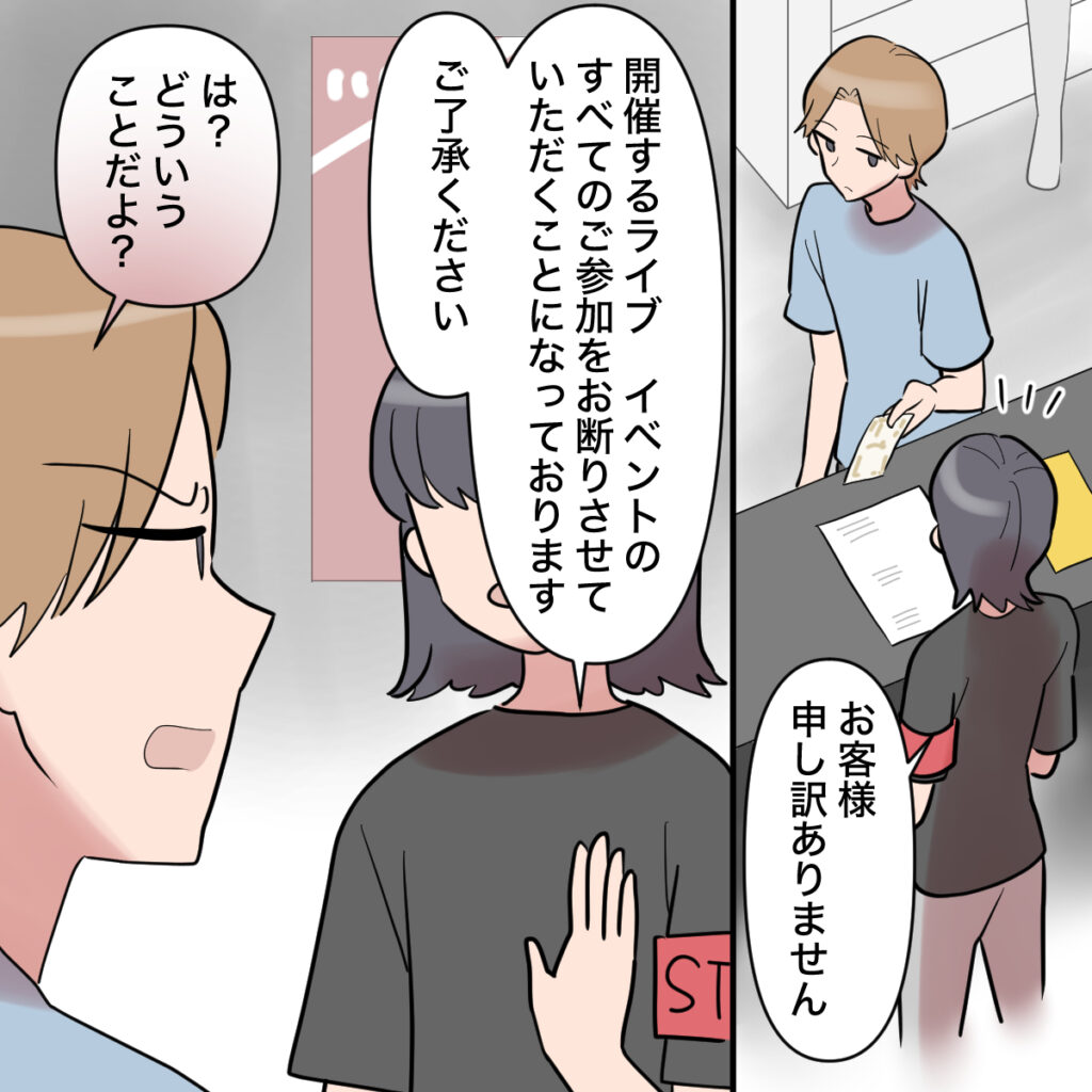 チケットを見せ、受付を通ろうとすると、「お客様申し訳ありません」と声をかけられ、「開催するライブ、イベントのすべてのご参加をお断りさせていただくことになっております。ご了承ください」と言われ、「は?どういうことだよ?」と苛立ちながら言い、
