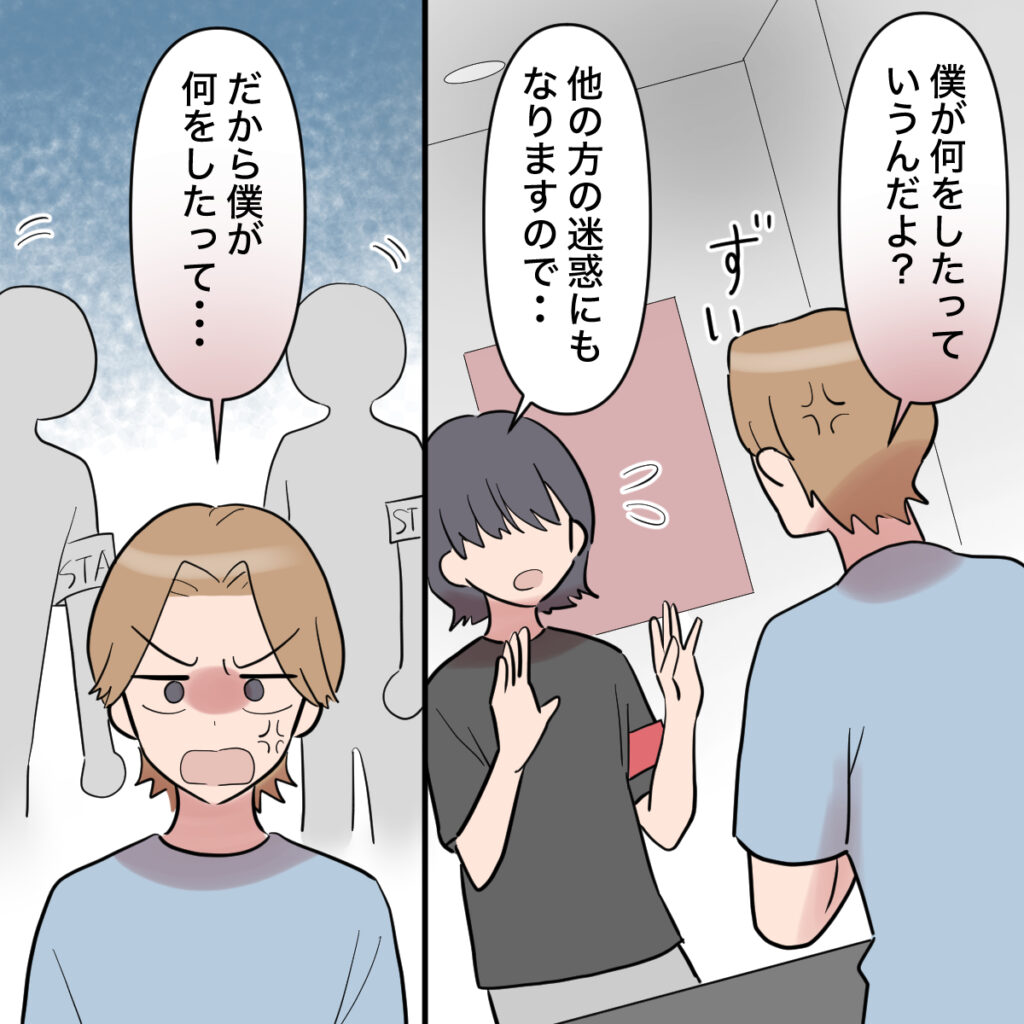 「僕が何したっていうんだよ?」と詰め寄ると、「他の方の迷惑にもなりますので・・」と断られ、「だから僕が何をしたって・・」とごねていると、後ろに人の気配が。