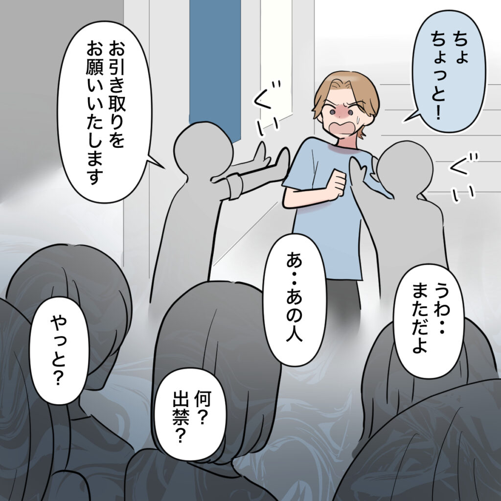 「ちょ、ちょっと!」と文句を言うも、「お引き取りをお願いいたします」そう言いながら、出口の方へと押し出そうとするスタッフ。その様子を見た周りの人は、「うわ・・まただよ」「あ・・あの人」「何?出禁?」「やっと?」とざわざわと声が聞こえてきました。