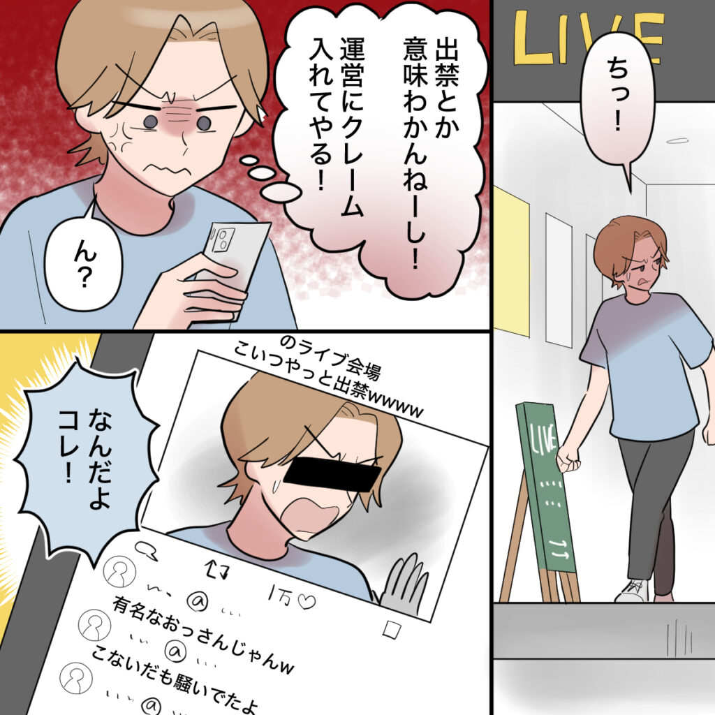 ライブ会場の外に追い出されてしまったオサムは、「ちっ!」と舌打ちしながら、「出禁とか意味わかんねーし!運営にクレーム入れてやる!」とスマホを見ると、「@ライブ会場 こいつやっと出禁wwwww」「有名なおっさんじゃんw」「こないだも騒いでたよ」と自分がSNSで叩かれているのを見て、「なんだよコレ!」と叫びました。
