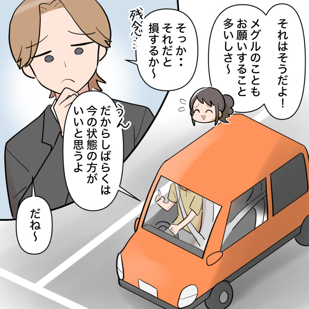 「それはそうだよ!メグルのこともお願いすること多いしさ~」そう言うと、「そっか・・それだと損するか~。残念・・」と本当に残念そうに言うオサムを見て、「うん。だからしばらくは今の状態の方がいいと思うよ」それを聞いて「だね~」とオサムは仕方なさそうに納得しました。