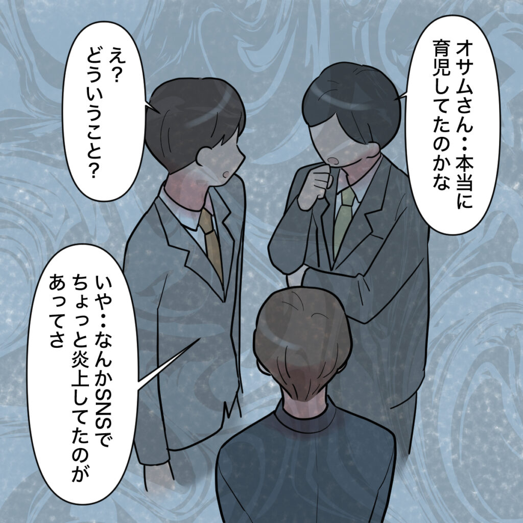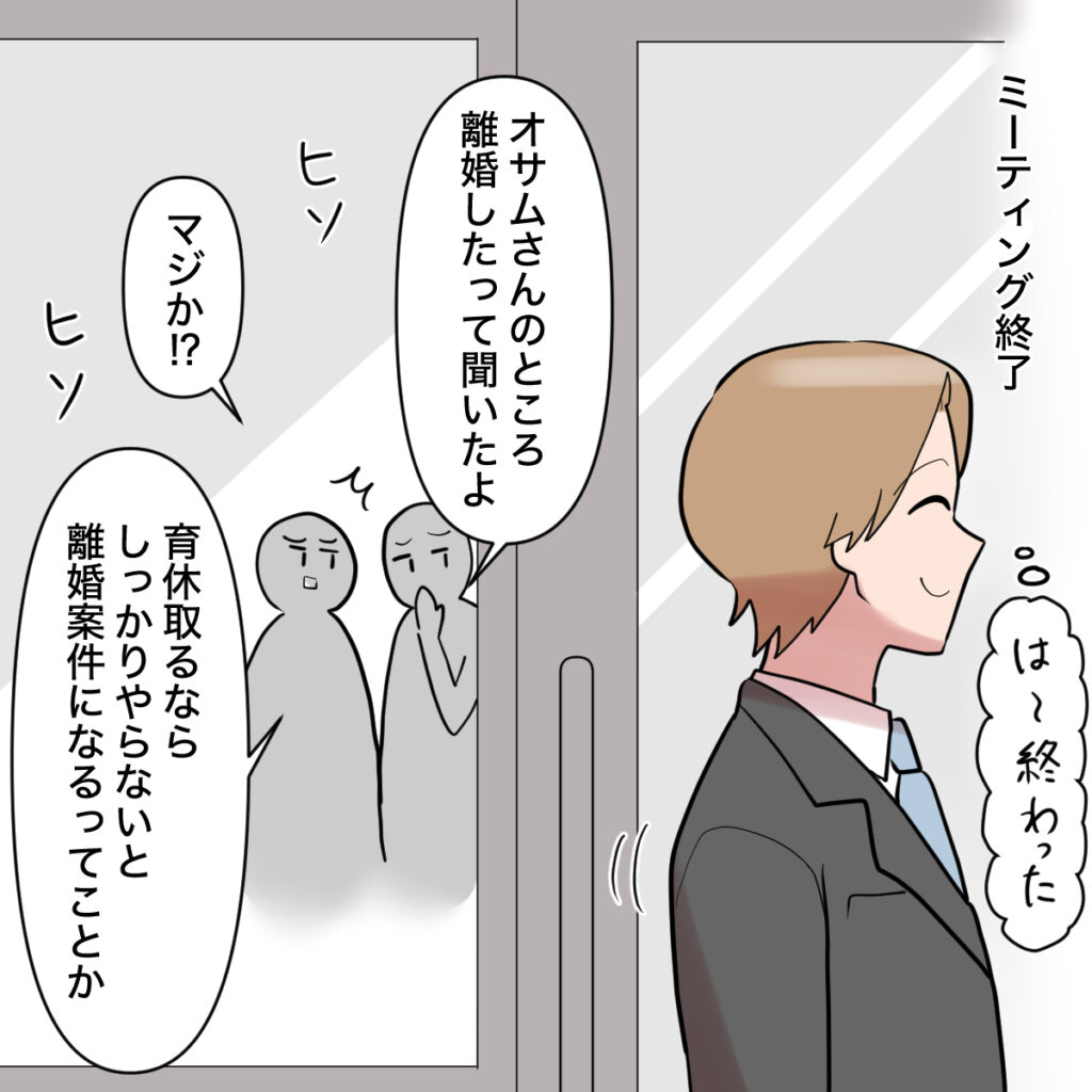 社内では、オサムさんが離婚したことが広まり、育休を取るならしっかりやらないと離婚案件になるということかとこれから育休を取ろうとしている社員たちは反面教師としてオサムさんを見るのでした。