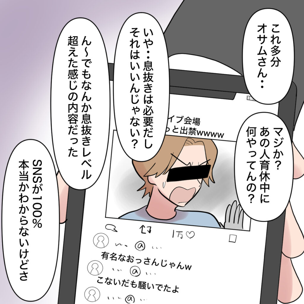 オサムさんが育休中に家事も育児もマホさんに押し付けてひとり時間を満喫していた頃にお金を貢いでいた推し側から出禁を言い渡されたことがSNSで炎上していたのです。そこに写る男性の画像は、目元を隠しているとはいえ、どう見てもオサムさんと分かるものでした。