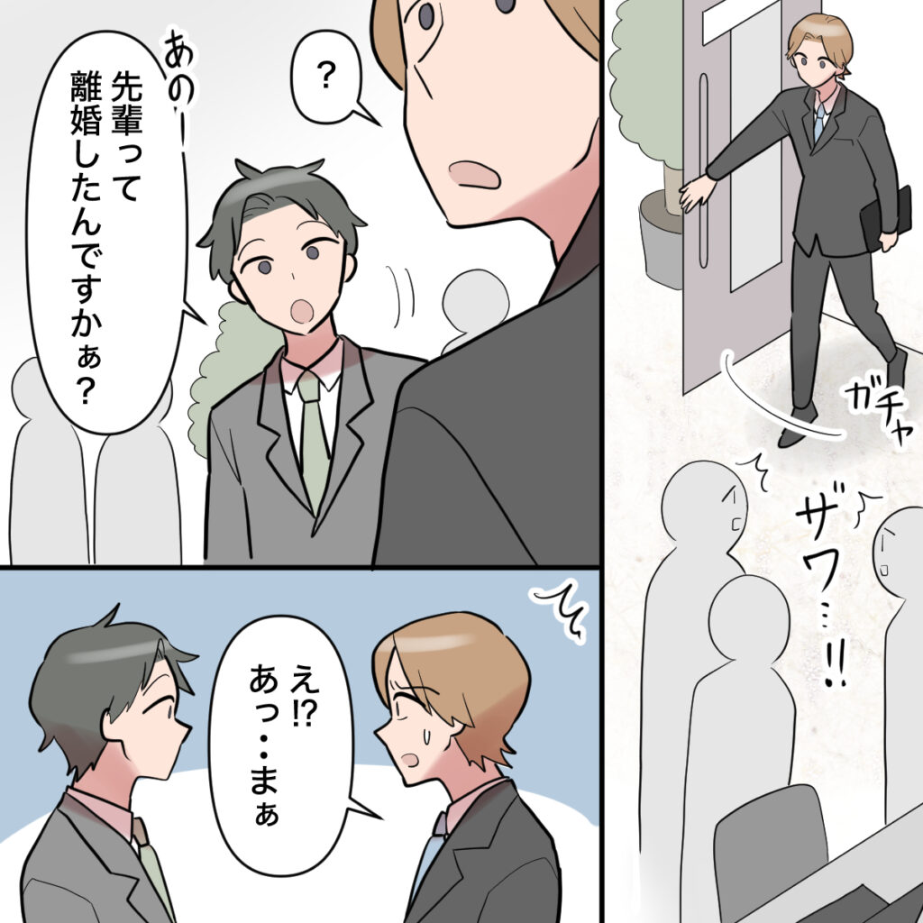 社員たちがザワつく中、ミーティングを終えて戻ってきたオサムさんに後輩社員が「あの、先輩って離婚したんですかぁ?」とズバリ。ギクリとしたオサムさんは「え!?あっ、まぁ。」と言葉を濁しました。