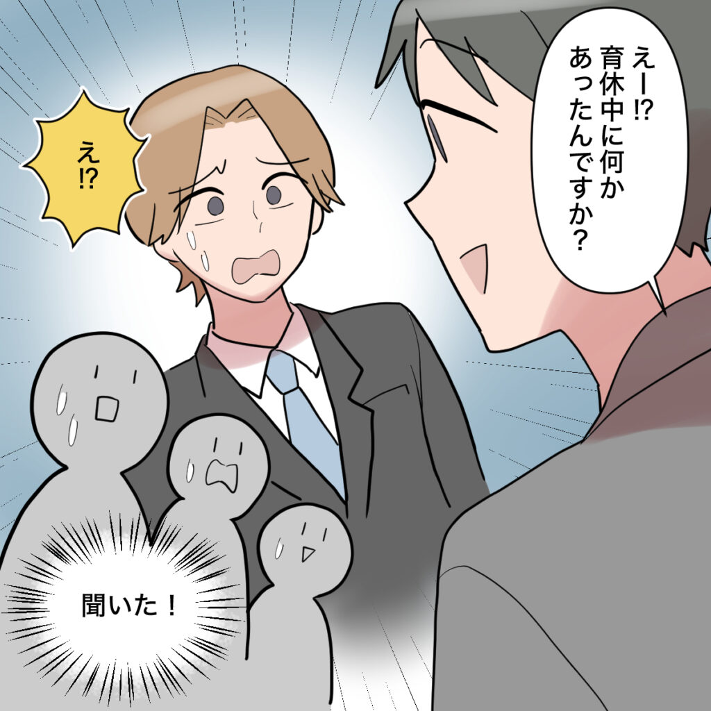 ところが空気を読まない若手社員。「えー!?育休中に何かあったんですか?」と聞きにくいことを笑顔でズバリと聞いたので、周りの社員たちは固唾をのんで見守りました。