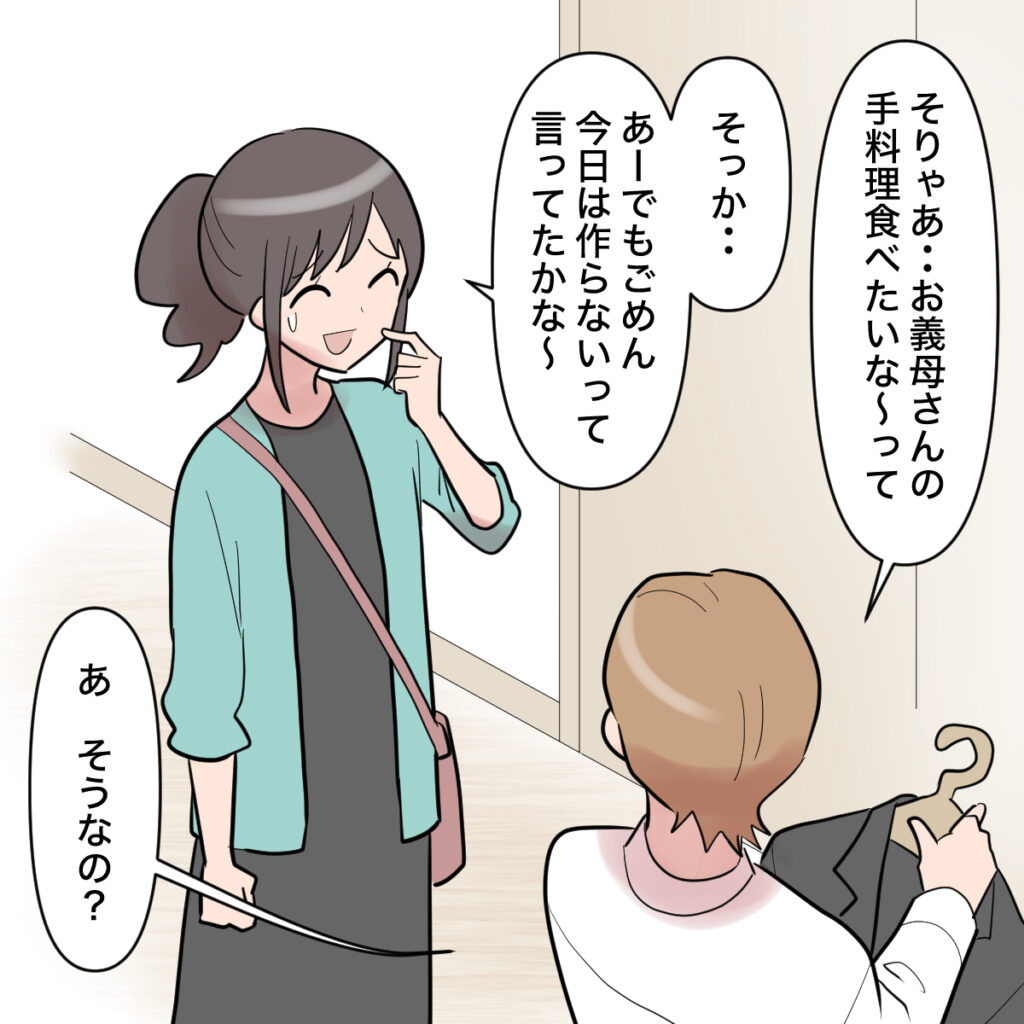 「そりゃ・・お義母さんの手料理食べたいな~って」と言うオサムさんに「そっか・・あーでもごめん。今日は作らないって言ってたかな~」マホさんの言葉に「あ、そうなの?」と言った後、