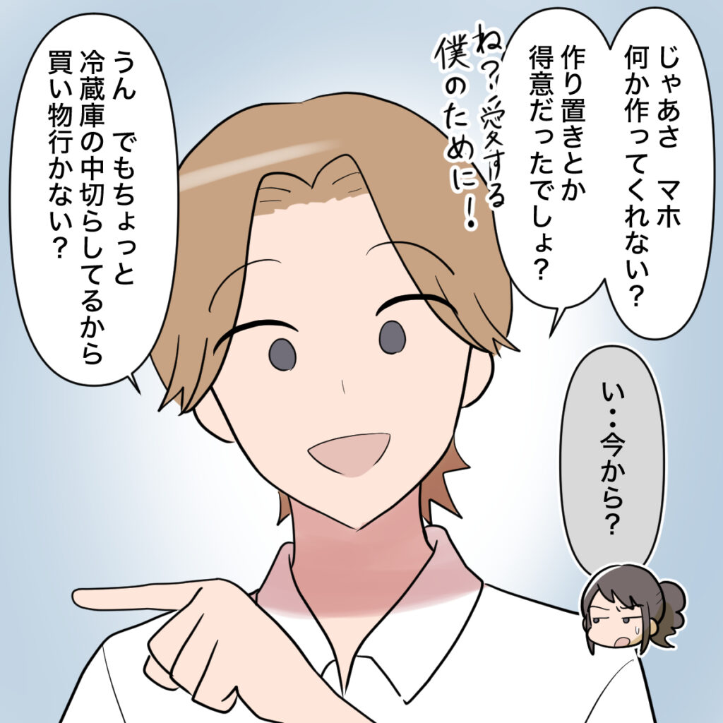 「じゃあさ、マホ何か作ってくれない?作り置きとか得意だったでしょ?ね?愛する僕のために!」と言い出して、「い・・今から?」と聞き返すと、「うん。でもちょっと冷蔵庫の中切らしてるから買い物行かない?」とオサムさんが言いました。
