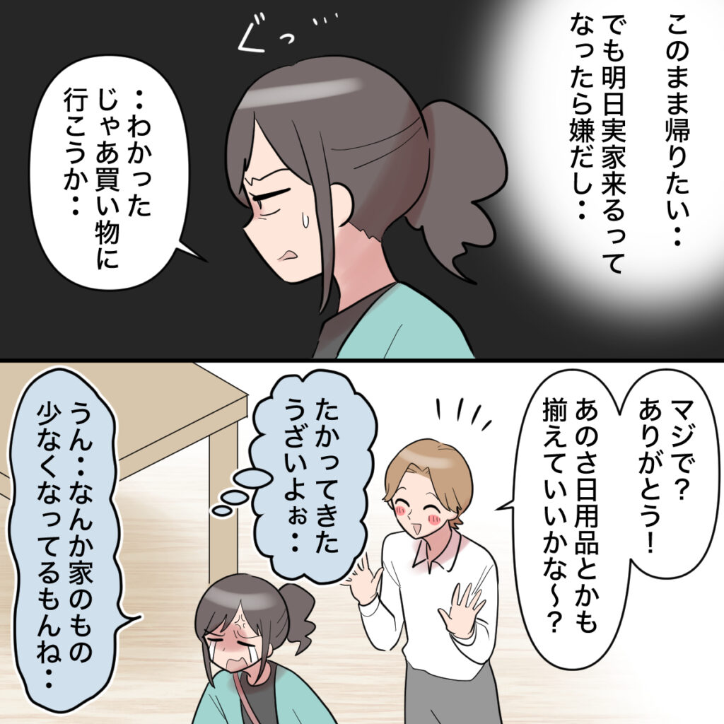オサムさんにそう言われて、「このまま帰りたい・・。でも、明日実家来るってなったら嫌だし・・」そう思いながら、「・・わかった。じゃあ買い物に行こうか・・」とマホさんが言うと、「マジで?ありがとう!あのさ、日用品とかも揃えていいかな~?」と言い出して、「たかってきた。うざいよぉ・・」と思いながら「うん・・なんか家のもの少なくなってるもんね・・」と泣く泣く答えました。
