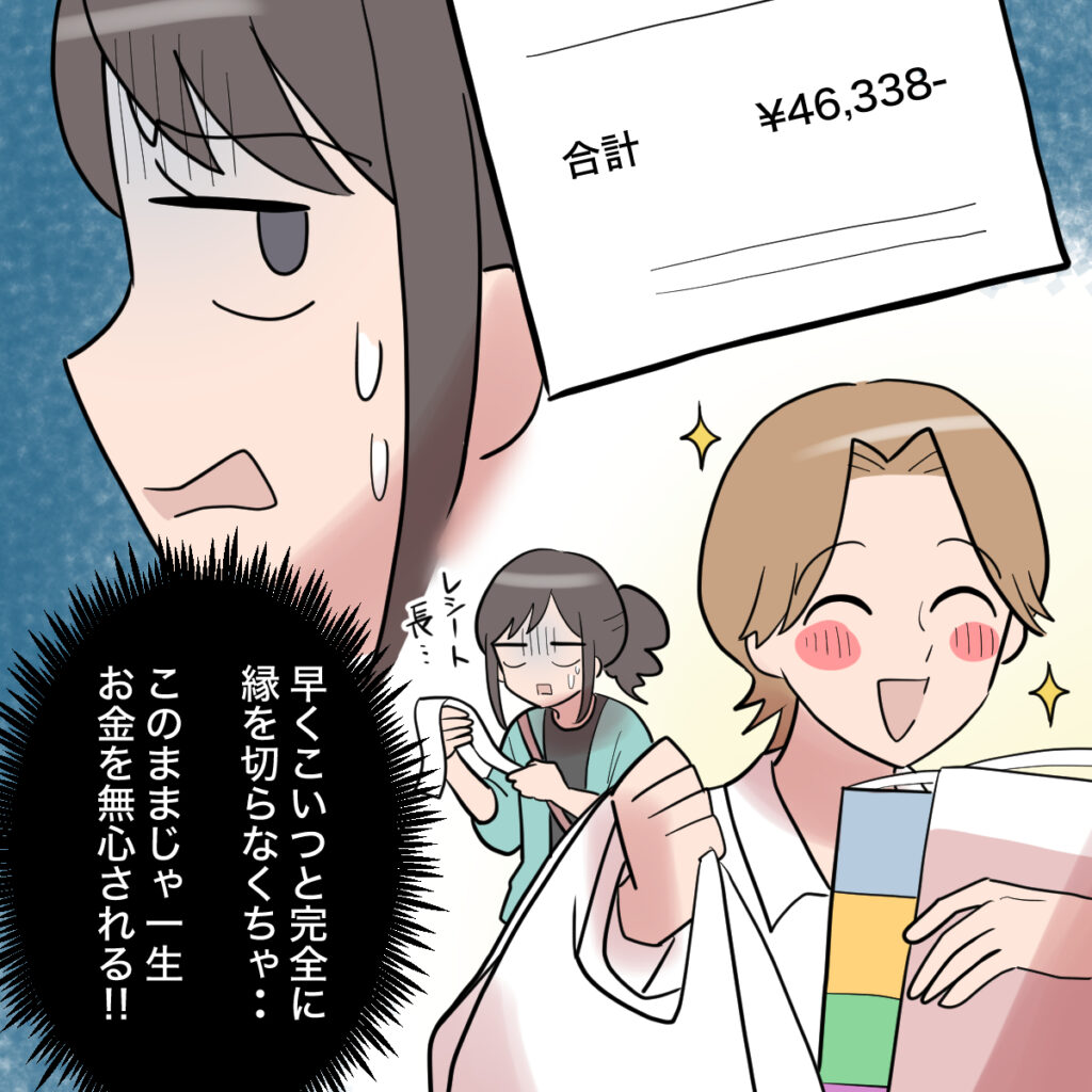 食料品に日用品、オサムさんの言うままいろいろ揃えていたら、なんと5万円近くになっていまい、「早くこいつと完全に縁を切らなくちゃ・・このままじゃ一生お金を無心される!!」とマホさんは必死に考えていました。