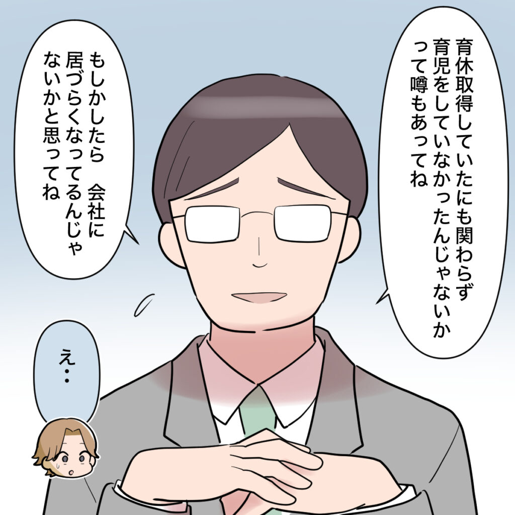 「育休取得していたにも関わらず、育児をしていなかったんじゃないかって噂もあってね。もしかしたら、会社に居づらくなってるんじゃないかと思ってね」上司の言葉に「え・・」と驚くオサムさん。