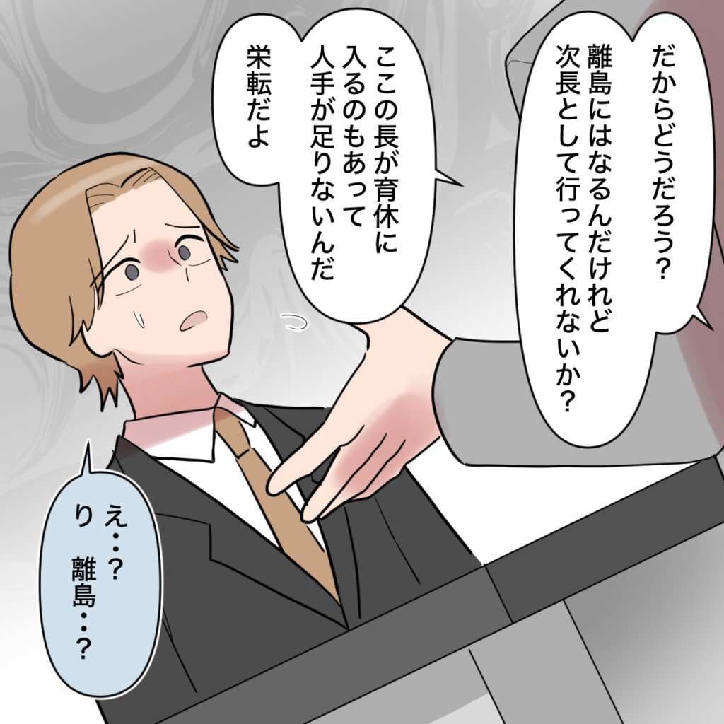 「だからどうだろう?離島にはなるんだけれど、次長として行ってくれないか?ここの長が育休に入るのもあって、人手が足りないんだ。栄転だよ」上司がそう言うと、「え・・?り、離島?」突然のことで頭の中が整理できないオサムさんに、
