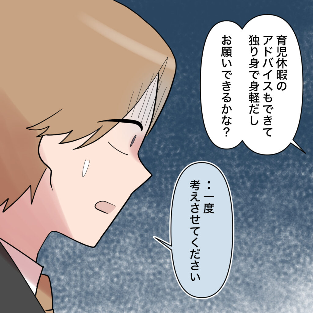 「育児休暇のアドバイスもできて、独り身で身軽だし、お願いできるかな?」そう言われ、「・・一度考えさせてください」と答えるのが精いっぱいでした。