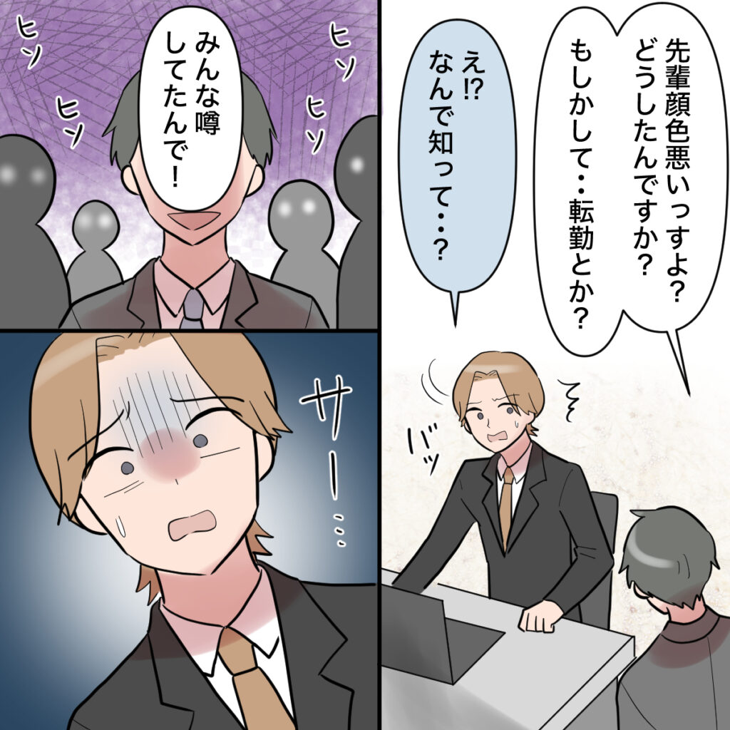 そして席に戻ると、「先輩顔色悪いっすよ?どうしたんですか?もしかして・・転勤とか?」そう言われ、「え!?なんで知って・・?」と振り返ると、「みんな噂してたんで!」と答える後輩の言葉に、サーっと血の気が引くオサムさんでした。