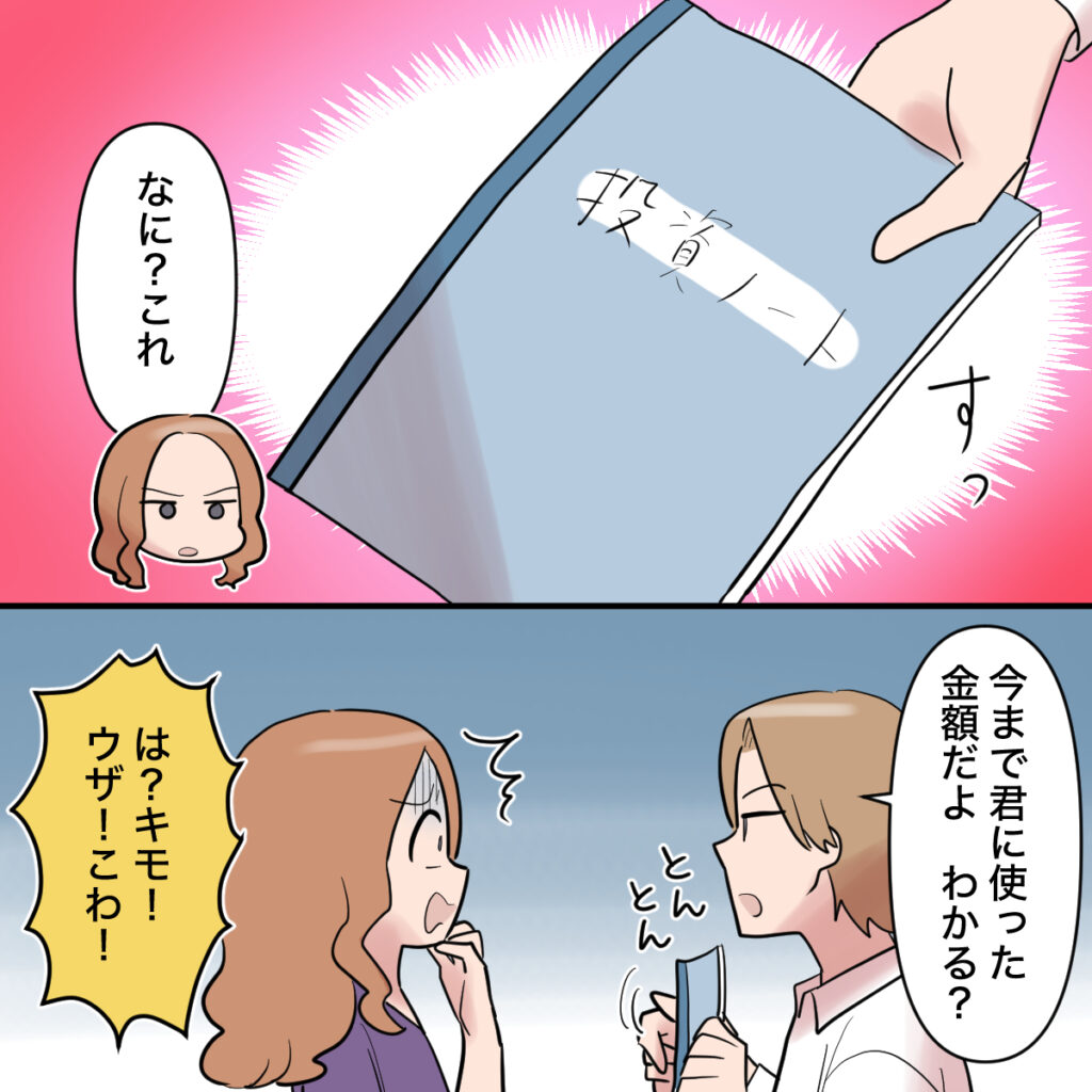すっと投資ノートを差し出すオサムさん。「なに?これ」と言う女性に、「今まで君に使った金額だよ。わかる?」とノートを指さしました。それを見て、「は?キモ!ウザ!こわ!」と女性はビックリ!