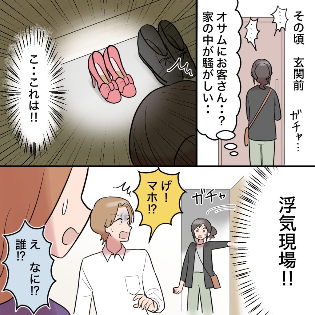 その頃、自宅玄関前にやって来たマホさんは、「オサムにお客さん・・?家の中が騒がしい・・」と思い、そっとドアを開けると、「こ・・これは!!浮気現場!!」そう思い、リビングのドアを開けると、「げ!マホ!?」と驚くオサムさんと、「え、なに!?誰!?」と女性まで驚きました。