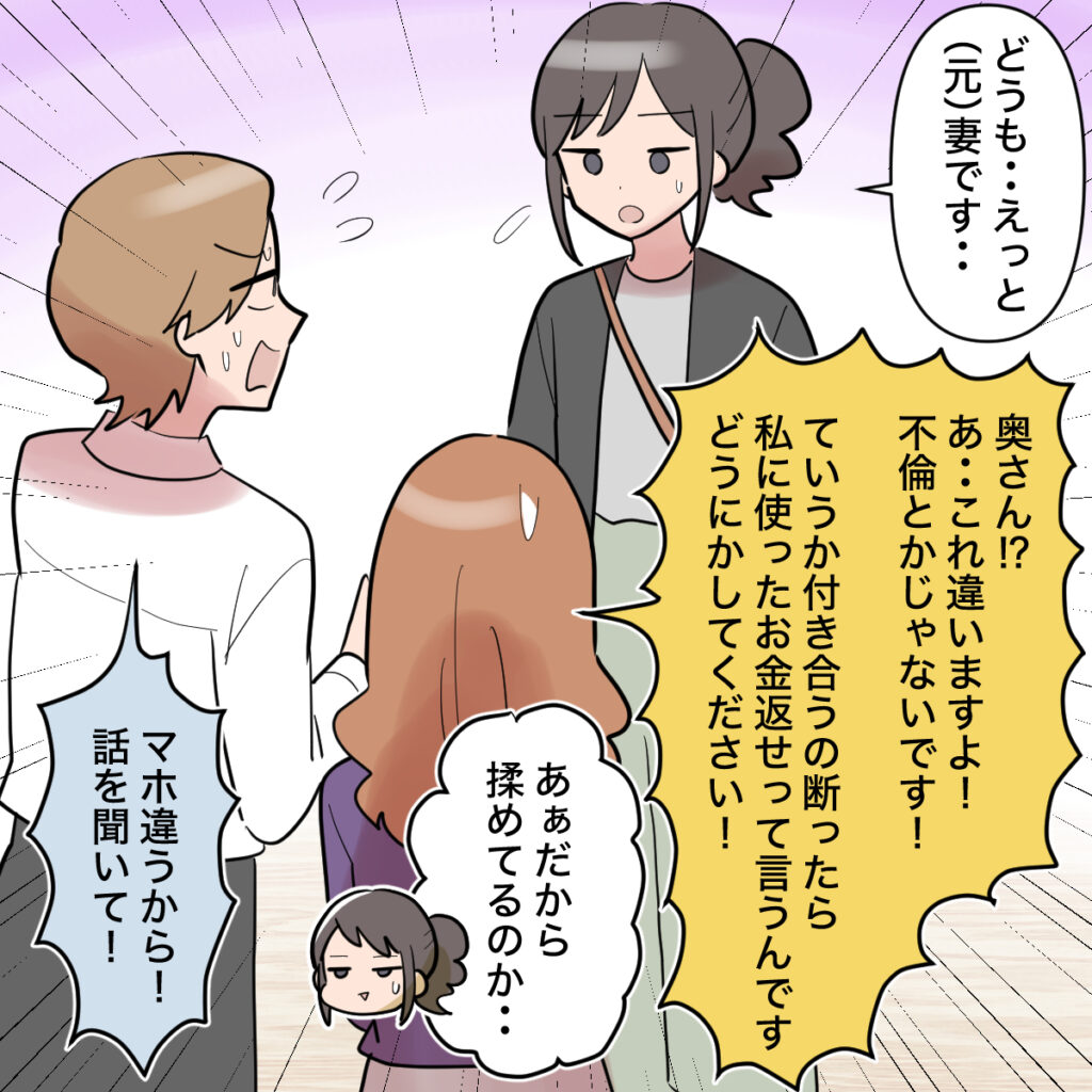 「どうも・・えっと(元)妻です・・」と言うと、「奥さん!?あ・・これ違いますよ!不倫とかじゃないです!ていうか、付き合うの断ったら、私に使ったお金返せっていうんです。どうにかしてください!」と訴える女性。その言葉を聞いて、「あぁだから揉めてるのか・・」と呆れたように呟くと、「マホ違うから!話を聞いて!」と慌てるオサムさん。