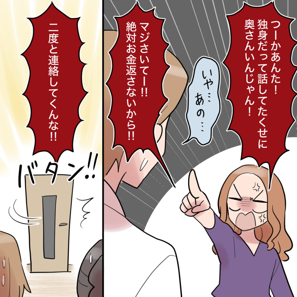「つーかあんた!独身だって話してたくせに奥さんいんじゃん!マジさいてー!!絶対お金返さないから!!」と言うと、「二度と連絡してくんな!!」と言い捨てて、家から出て行ったのでした。